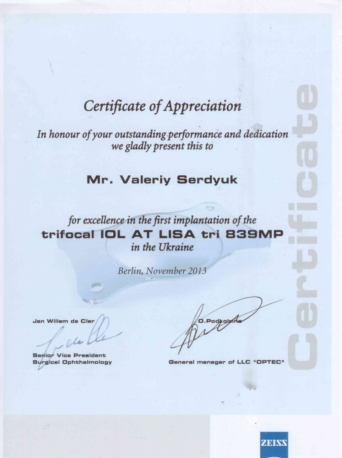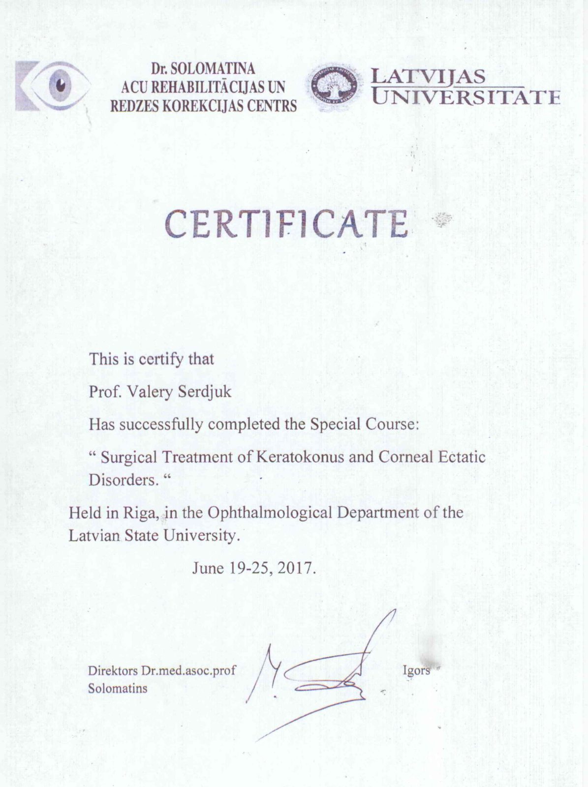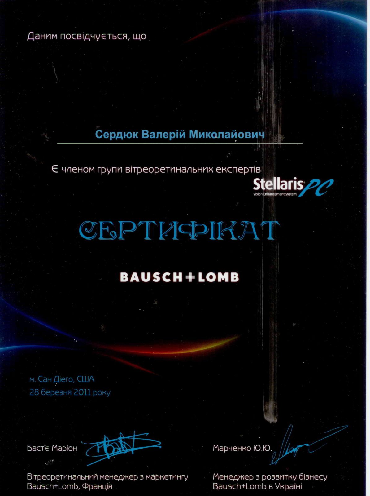 Валерій Миколайович Сердюк — доктор медичних наук, професор, провідний офтальмолог-хірург з більш ніж 30-річним досвідом. Засновник та керівник офтальмологічного центру Ophthalmology-group. Виконав понад 15 000 операцій на очах. Спеціалізується на мікрохірургії катаракти, кератопластиці, лікуванні глаукоми та складних патологій сітківки. Автор понад 100 наукових публікацій, має 12 патентів на винаходи в офтальмології.